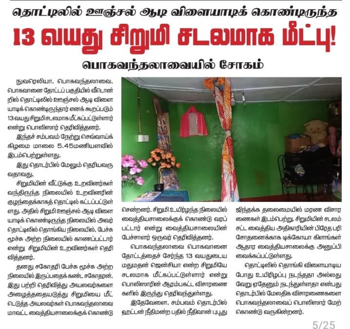 பலருக்கு ஆச்சரியமாக இருக்கலாம் சாதாரண ஊஞ்சல் சில சந்தர்ப்பங்களில் சிறுவர்களின் உயிர்களை பறித்துவிடும். இருதினங்களுக்கு முன்னரும் இவ்வாறான ஓர் துயர சம்பவம் பொகவந்தலாவ பிரதேசத்தில் நடைபெறுள்ளது. குறிப்பாக பெரியவர்கள் யாரும் அற்ற நிலையில் தனியே ஊஞ்சல் ஆடிய சிறுமியை இவ்வாறு பரிதாபகரமான முறையில் மரணத்தினை தழுவினார். இலங்கையில் இவ்வாறான சம்பவங்கள் மூலம் வருடம் ஒன்றில் சில சிறுவர்களின் உயிர்கள் பறிக்கப்படுகின்றன. இவ்வாறான சம்பவங்கள் தவிர்க்கப்பட்டிருக்க கூடியவையே. ஏன் இவ்வாறான சம்பவங்கள் நடைபெறுகின்றன , எவ்வாறு இந்த சம்பவங்களை தடுக்கலாம் என்பது பற்றி இந்த பதிவு விளக்குகின்றது.. ஊஞ்சல் ஆடுதல் என்பது தமிழரின் வாழ்வியலோடு இரண்டற கலந்த விடயம் ஆகும். தமிழரின் கடவுள் முதல் சாதாரண பாமர மக்கள் வரை வாழ்க்கையில் ஊஞ்சல் ஆடியிருப்பர். வித்தியாசம் பாவித்த பொருட்கள் மாத்திரமே. எம்மில் பலர் அம்மாவின் சேலை, மாடு கட்டும் நைலான் கயிறு, பொச்சு கயிறு போன்றவற்றினை பாவித்து ஊஞ்சல் ஆடியிருப்போம். இப்பொழுது உள்ள முக்கியமான கேள்வி எவ்வாறு இவ்மரணங்கள் நிகழுகின்றது? என்பதே.