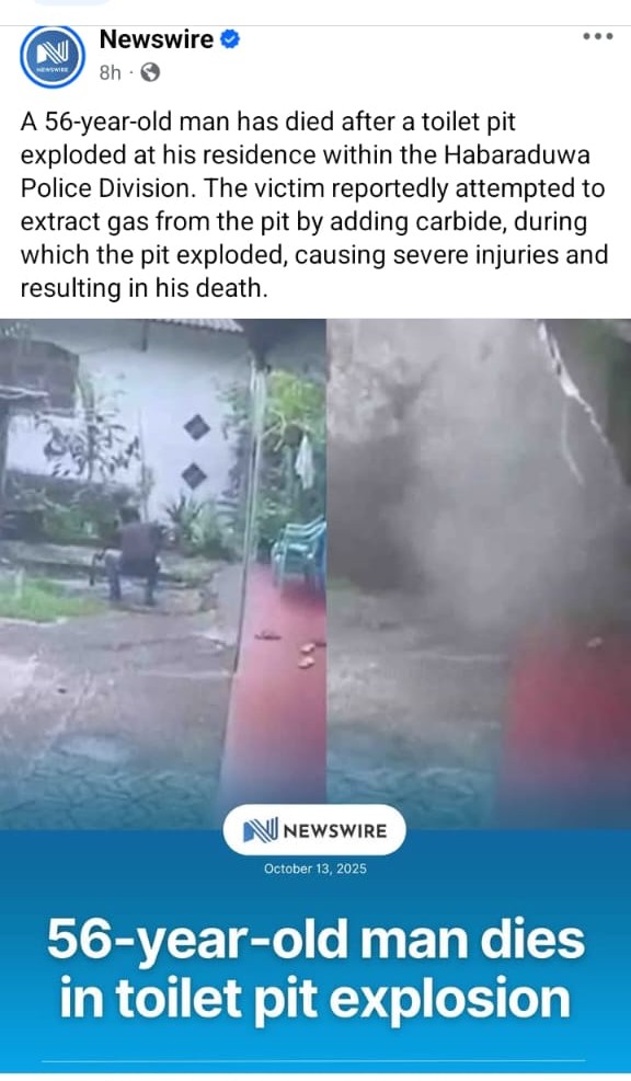 இலங்கையில், கல்சியம் கார்பைட் என்ற இரசாயனப்பொருள் பெரும்பாலும் மலசல கூட மற்றும் சமையலறைக் கழிவு குழாய்களில் ஏற்படும் அடைபாடுகளை நீக்க பயன்படுகிறது. துயர சம்பவம் நடந்த பகுதி,கொழும்பு மாநகரின் புறநகர் பகுதி அக்குடும்பத்தினரின் மலசலகூடம் ஆனது வீட்டுடன் இணைந்த நிலையில் இருந்தது. ஆனால் கழிவுத் தொட்டியானது (Septic tank) ஏறத்தாழ 30 அடி தூரத்தில் வளவின் பின்புறத்தில் அமைந்திருந்தது. அதிக தூர காரணமாக அடிக்கடி அவர்களது மலக்கழிவு கொண்டுசெல்லும் குழாயில் அடைப்பு ஏற்படும். வழமையாக அவர்கள் கல்சியம் காபைட் இணை பாவித்து அடைப்பு எடுப்பார்கள். அன்று மாலையும் அவ்வாறே ஏற்பட்டது. வீட்டு தலைவன், அவரது மச்சான் மற்றும் பிள்ளைகள் உடனடியாக காரியத்தில் இறங்கினர். தலைவர் கல்சியம் காபைட் கல்லுகளை மலக்குழியினுள் (Toilet pan) போட்டு இறப்பர் குழாய் மூலம் கழிவுத்தொட்டியினை நோக்கி தள்ளினார். மற்றவர்கள் கழிவுத்தொட்டியின் மேற்பகுதியில் உள்ள சிறு துவாரம் மூலம் அடைப்பு எடுபடுகின்றதா? என்று மாறிமாறி அவதானித்து வீட்டு தலைவனுக்கு சொல்லிக்கொண்டிருந்தனர். வெகுநேரம் ஆகியும் அடைப்பு எதுவும் எடுபட்ட மாதிரி தெரியவில்லை. இருளும் சூழ தொடங்கிவிட்டது. கடைசியாக மச்சான் தனது பொக்கற்றில் இருந்த சிகரற்று லைட்டறினை எடுத்து பற்றவைத்து பார்த்தார். ஒரு சிலவினாடிகள் தான் பெரும் வெடியோசை ஒன்று கேட்டது. மலசல கழிவுத்துத்தொட்டியினை சுற்றி நின்ற சிறுவர்கள், லைட்டரினை பற்ற வைத்து பார்த்த மச்சான் ஆகியோர் பலதூர அடிகளுக்கு அப்பால் தூக்கி வீசப்பட்டனர். மலசல கழிவுத்தொட்டியின் சிமெந்து மூடியும் தூக்கி வீசப்பட்டது. அவர்களில் மச்சான் தலையில் ஏற்பட்ட அதிக காயம் காரணமாக உடனேயே மரணித்தார். இராணுவமும் போலீசாரும் குவிக்கப்பட்டு ஏதாவது வெடிபொருள் வெடித்ததா? என்ற கோணத்தில் விசாரணை தொடங்கியது.