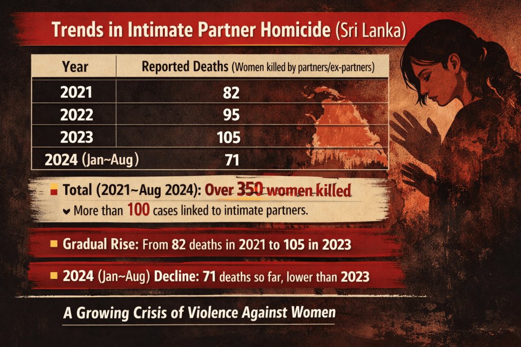 நெருங்கிய உறவு கொலை கடந்த சில ஆண்டுகளில் கவலைக்கிடமான அளவில் அதிகரித்துள்ளது. காவல்துறை பதிவுகளின்படி, 2021 இல் 82, 2022 இல் 95, 2023 இல் 105 பெண்கள் தங்கள் துணையால் அல்லது முன்னாள் துணையால் கொல்லப்பட்டுள்ளனர். 2024 ஆகஸ்ட் மாதம் வரை 71 மரணங்கள் பதிவாகியுள்ளன.