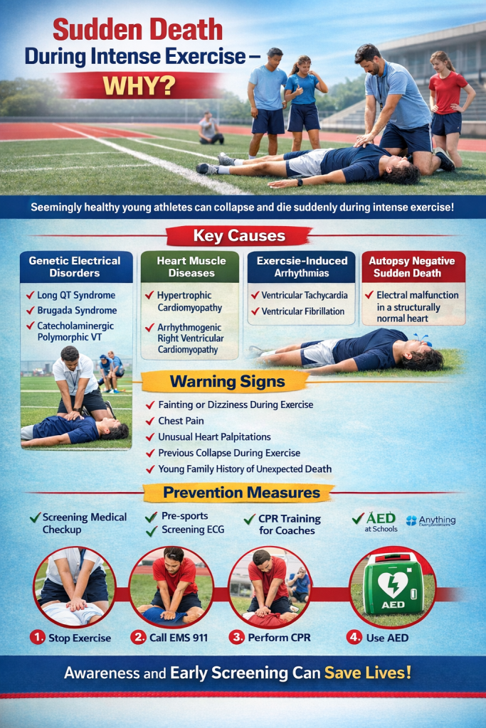கடுமையான உடற்பயிற்சியின் போது இதய துடிப்பு வேகம் அதிகரிக்கும், உடலில் அட்ரினலின் அளவு உயரும் மற்றும் இதயத்திற்கு ஆக்ஸிஜன் தேவையும் அதிகரிக்கும். இந்த சூழலில், சிலரிடம் இதய மின்சார செயல்பாடு திடீரென சீர்குலைந்து ஆபத்தான சீரற்ற இதயத் துடிப்பு ஏற்படலாம். இதன் காரணமாக சில நிமிடங்களுக்குள் இரத்த ஓட்டம் நிற்கும் மற்றும் திடீர் மரணம் ஏற்படும். உடற்கூறு பரிசோதனையில் இதய அமைப்பு சாதாரணமாகவே இருக்கும்.